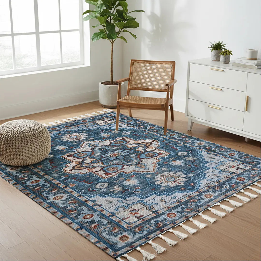 The Digital Printed Rug with Classic Central Medallion and Symmetrical Patterns merges old-world elegance with modern practicality. Unlike traditionally woven rugs, this digitally printed alternative captures intricate details while offering enhanced durability and effortless maintenance.